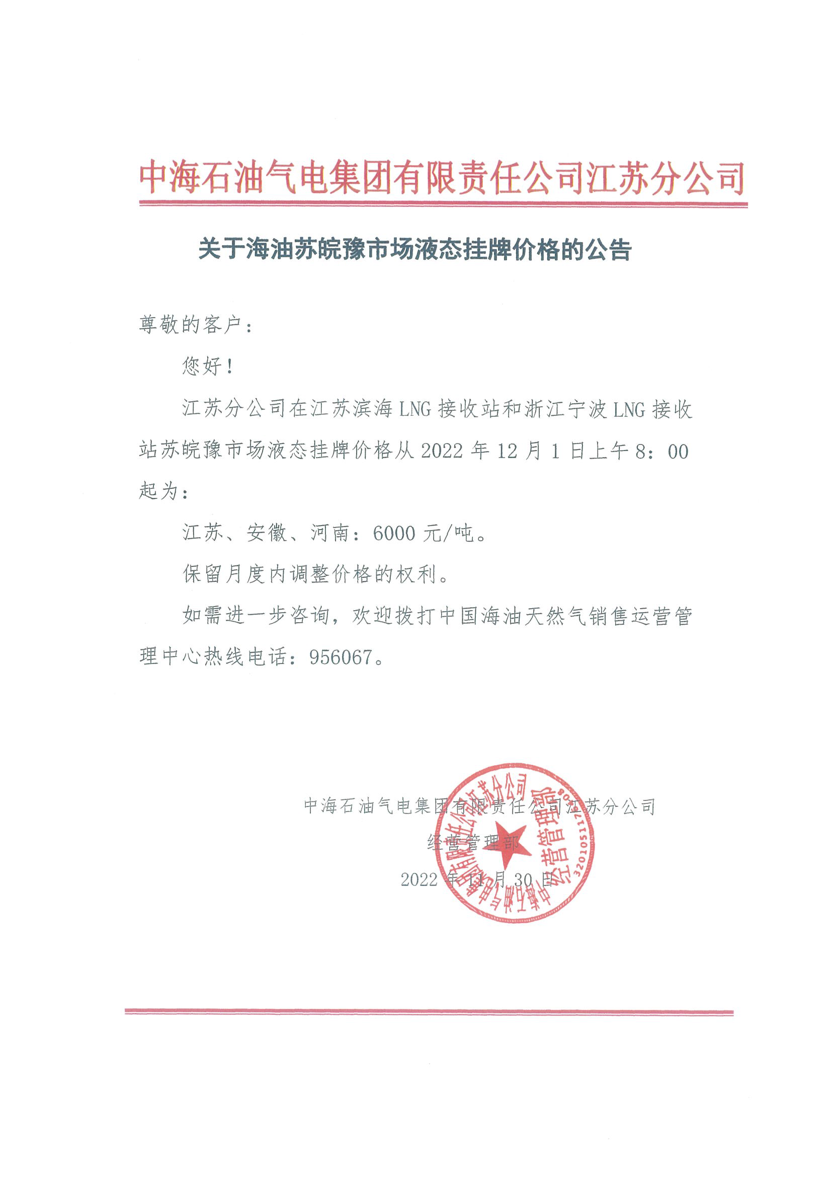 中海油江苏分公司关于12月1日华东苏皖市场价格调整公告