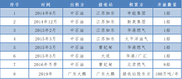 2014年8月起,中石油率先通过线下商谈形式向合作伙伴开放了一些接收站窗口期,开展了基础设施向第三方开放尝试,据不完全统计,接收站拥有方陆续开展了以下第三方开放业务: