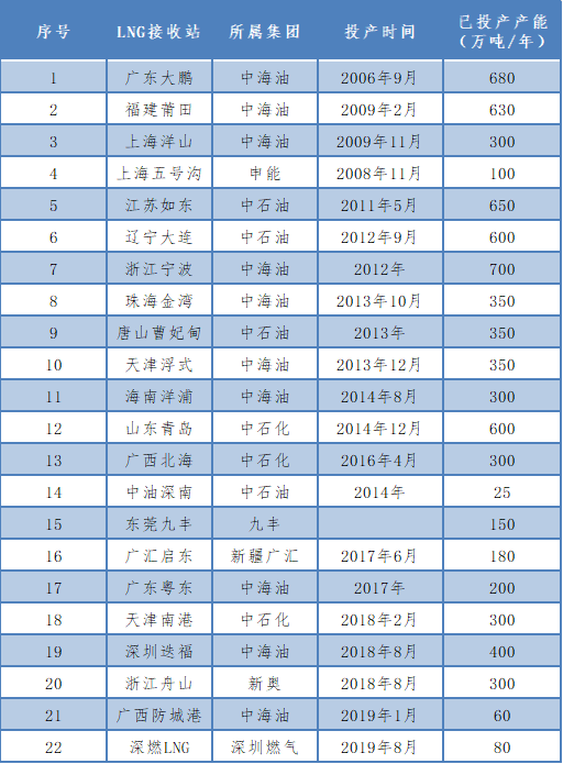 截至2019年12月,我国已投运LNG接收站22座,2019年投运的LNG接收能力为140万吨/年。详见下表: