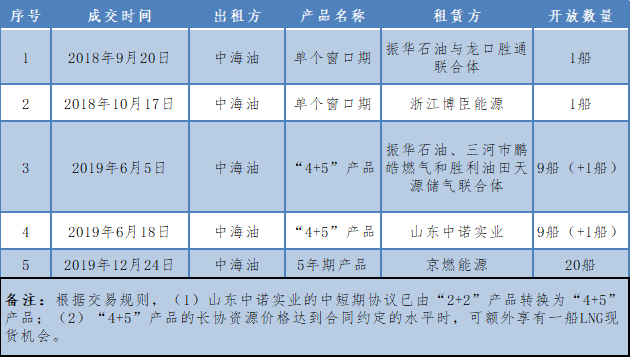 为了将接收站开放模式推向市场化,2018年9月20日起,中海油联合上海石油天然气交易中心发挥第三方平台公开、公平、透明的作用,分别推出了LNG窗口期一站通单个产品、短期协议和长期协议,开启了国内接收站开放的新模式,详见下表: