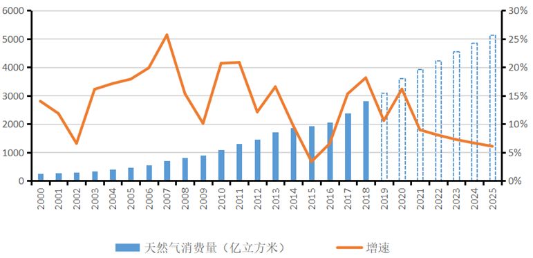 2018年我国天然气表观消费量2803亿立方米,年均增速12.5%,远高于全球2.5%的平均增速。业内机构预测,到2025年,我国天然气表观消费量将达到5139亿立方米,但从2021年开始,预测增速有所放缓,低于10%增速。我国天然气消费情况如下图: