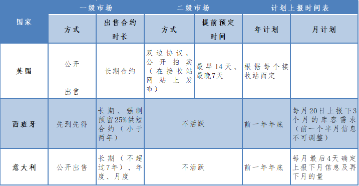 西班牙的一级市场遵循先到先得(First Come First Serve FCFS)的原则,由于接收能力富裕,基本能满足所有预订者的需求,且在长期合约之外,还预留了至少25%的接收能力供短期贸易(小于两年)使用,由LNG接收站运行商统筹。