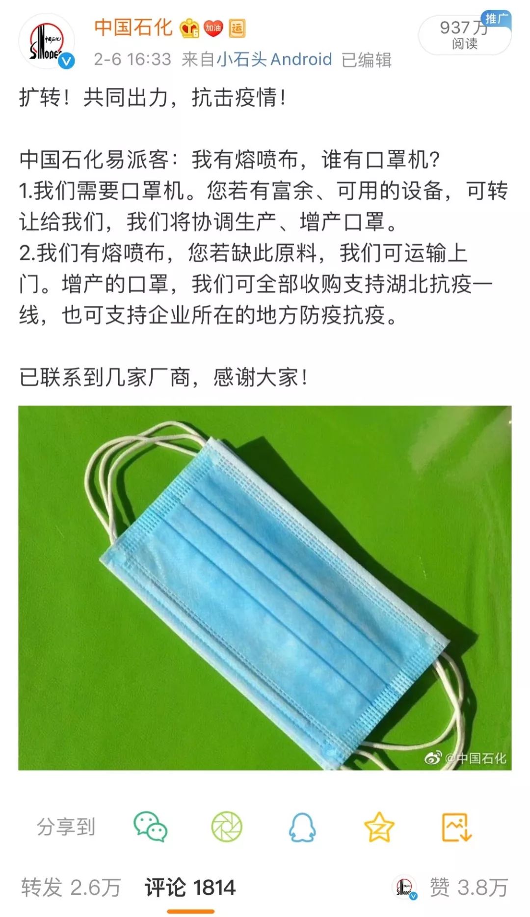 2月6日下午16:30左右,中国石化官方微博发布消息:《我有熔喷布,谁有口罩机》,至今阅读量已超过900万,被转发2.6万次。易派客微信公众号也发布了这条消息,阅读量迅速超过10万+。