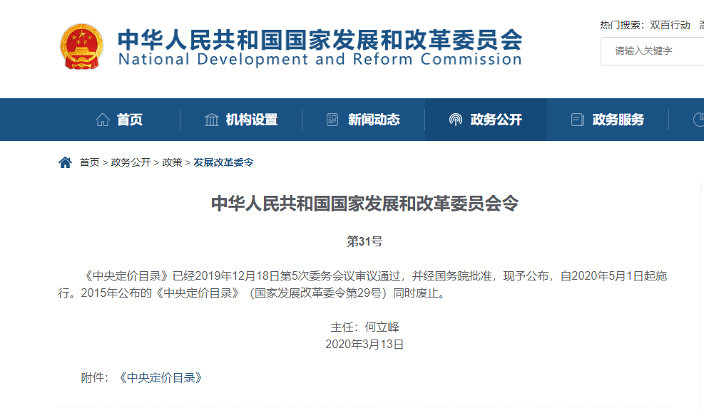 2020版《中央定价目录》