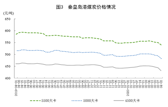 煤炭进口增加,交易价格下跌。3月份,进口煤炭2783万吨,同比增长18.5%;一季度,进口煤炭9578万吨,同比增长28.4%。港口煤炭综合交易价格小幅下跌,4月3日秦皇岛港5500、5000和4500大卡煤炭价格分别为每吨540元、483元和432元,比2月28日分别下跌16元、19元和20元。