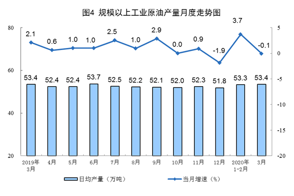 3月份,规模以上工业原煤生产由降转升,原油生产略有下降,天然气生产加快,电力生产降幅收窄。