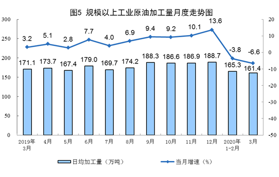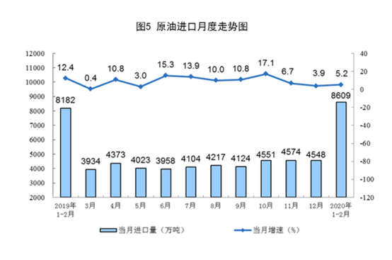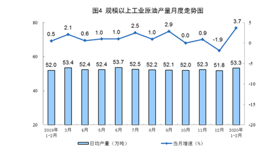 国家统计局3月16日发布的数据显示,2020年1-2月,我国原油生产保持增长,加工量下降。1-2月份,我国生产原油3200万吨,日均产量53.3万吨,同比增长3.7%;进口原油8609万吨,同比增长5.2%;加工原油9919万吨,日均加工165.3万吨,同比下降3.8%。国际原油价格大幅下跌,2月28日布伦特原油现货离岸价格为51.3美元/桶,比上年12月31日下跌16.5美元,跌24.3%。