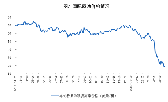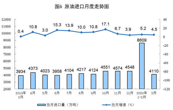 原油进口稳定增长,国际原油价格跌幅较深。3月份,进口原油4110万吨,同比增长4.5%。一季度,进口原油12719万吨,同比增长5.0%。3月31日布伦特原油现货离岸价格为19.19美元/桶,比2月28日的51.31美元/桶下跌62.6%。