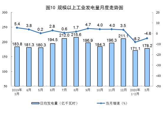 电力生产降幅收窄。3月份,发电5525亿千瓦时,同比下降4.6%,日均发电178.2亿千瓦时。一季度,发电15822亿千瓦时,同比下降6.8%。