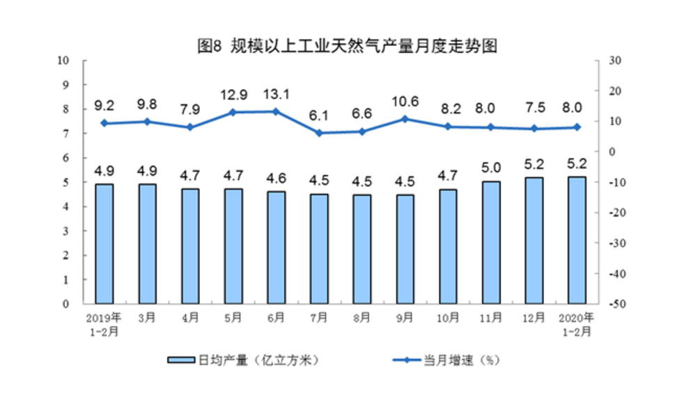 国家统计局3月16日发布的数据显示,今年1-2月,我国天然气生产较快增长。1-2月份,生产天然气314亿立方米,日均产量5.2亿立方米,同比增长8.0%;进口天然气1780万吨,同比增长2.8%。