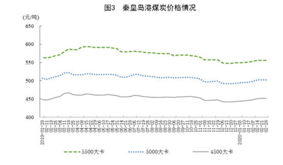 国家统计局3月16日发布的数据显示, 1-2月份,我国生产原煤4.9亿吨,日均产量815万吨,同比下降6.3%;进口煤炭6806万吨,同比增长33.1%。港口煤炭综合交易价格有所上涨,2月28日秦皇岛港5500、5000和4500大卡煤炭价格分别为每吨556元、502元和452元,比1月3日分别上涨7元、8元和8元。