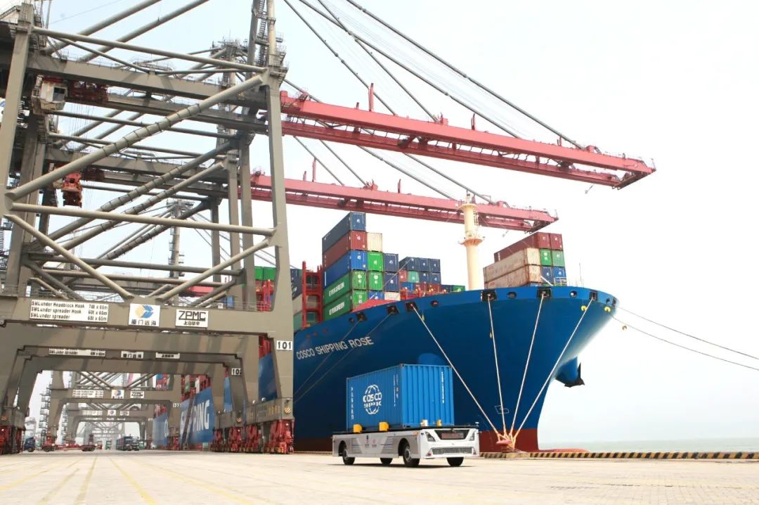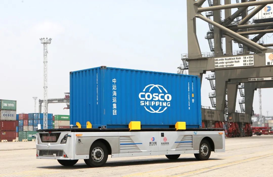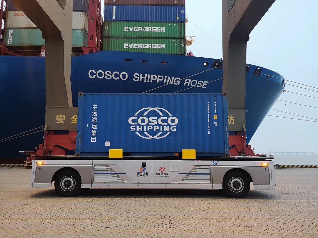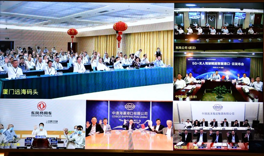 中远海运在上海举行“5G+无人驾驶赋能智慧港口”云发布会现场。 5月11日,中远海运、中国移动、东风公司联合在北京、上海、武汉、十堰、香港和厦门六个城市,通过中国移动5G+云视讯系统举行“5G+无人驾驶赋能智慧港口”云发布会。厦门市委副书记、市长庄稼汉,中远海运董事长许立荣,中国移动董事长杨杰,东风公司董事长竺延风出席发布会,共同见证了全国首个5G全场景应用智慧港口在厦门远海码头由试验阶段进入落地使用阶段。 一个港口的作业,全部靠5G实现智慧操作会是什么样子呢?在5G技术基础上进行远程控制港口吊机、无人驾驶集装箱卡车运送等动作会是什么样的效果呢? 让我们先跟着央视记者的镜头,到全国首个5G全场景应用智慧港口——中远海运集团旗下中远海运港口厦门远海码头现场来探个究竟吧。 发布会上,在厦门远海码头现场,一辆港口无人驾驶集装箱卡车,从中远海运玫瑰轮船边102号岸桥下交箱装船,101号岸桥下卸船接箱,并从厦门远海码头前沿行驶至经一路,自动避让道路上的障碍驶入F1堆场,完成与轮胎吊精准对位,堆场落箱等系列操作,顺利完成装卸船作业流程。这标志着中远海运、中国移动、东风公司联合开发的首台定制港口无人驾驶集装箱卡车通过了实际生产运行试验,为5G智慧港口建设奠定了重要基础。 与传统自动化码头技术不同,此次试验采用了5G信号传输,发挥了 5G 大带宽、低时延、海量连接优势,极大提升信息交互效率,实现对设备的精准控制。 除了通过5G技术实现集装箱卡车自动驾驶外,此次厦门远海码头还将5G技术运用在了港机远控、智能理货、智能安防等具体业务场景,实现了对港口全场景的智慧赋能。5G智慧港口的建设,不仅是“围绕产业链部署创新链、围绕创新链布局产业链”,加快推进新基建和交通强国建设的重要实践,同时对在新冠肺炎疫情期间,助力港口抗“疫”,加快推进复工复产,保障全球供应链畅通具有十分重要的意义。 在发布会上,三方还联合发布了《港口无人驾驶集装箱卡车性能和测试方法》企业联合标准、《5G智慧港口全业务场景落地白皮书》和《5G智慧港口实施方案和路线图》,为国内外5G智慧港口建设提供了值得参照的实践样本。