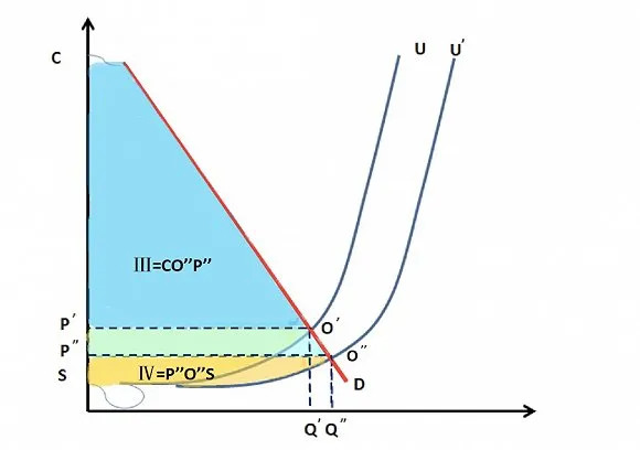 全球石油均衡价格降为P’’,实际交易量为Q’’,石油生产商的销售收入降为P’’*Q’’(P’’*Q’’应该小于P’*Q’),总利润降为:VI=P’’O’’S的面积;石油消费者支付总额为P’’*Q’’,消费者的福利或剩余增加为:III=CO’’P’’的面积。
