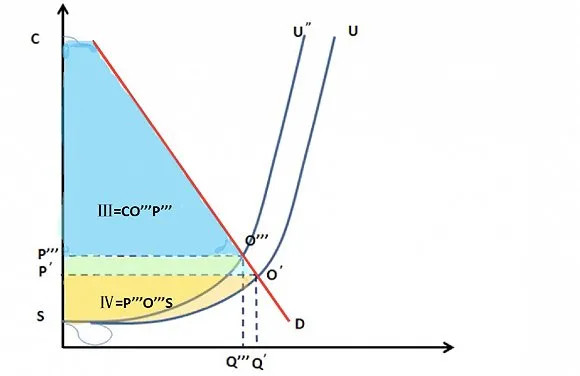 全球石油均衡价格从P’’升到P’’’,实际交易量从Q’’降到Q’’’,石油生产商的销售收入为P’’’*Q’’’(P’’’*Q’’’应该大于P’’*Q’’),总利润上升为:VI=P’’’O’’’S的面积;石油消费者支付总额为P’’’*Q’’’,消费者的福利或剩余下降为:III=CO’’’P’’’的面积。
