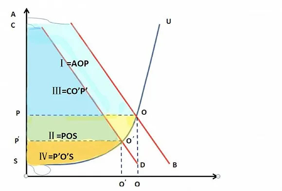 全球石油均衡价格降为P’,实际交易量为Q’,石油生产商的销售收入降为P’*Q’,总利润降为:IV=P’O’S的面积;石油消费者支付总额为P’*Q’,消费者的福利或剩余为:III=CO’P’的面积。