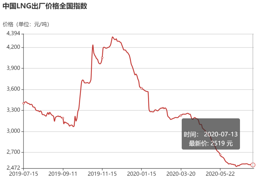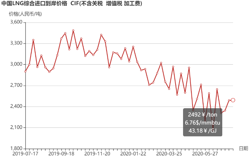 7月15日,海关总署全球贸易监测分析中心和上海石油天然气交易中心联合发布的中国LNG综合进口到岸价格显示,7月6日-12日,中国LNG综合进口到岸价格为2492元/吨(C.I.F不含税费、加工费),较前一周上涨3元/吨,涨幅0.1%,与去年同期相比,下降18.9%。
