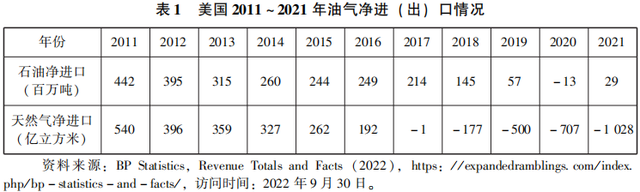 首先,页岩革命使美国完全实现了能源独立。2007年起美国页岩开发实现了革命性突破,页岩油气产量呈井喷式增长,油气净进口量快速下降,天然气于2017年实现净出口,2021年净出口量达到1 028亿立方米(见表1);石油可望在2022年实现净出口。美国于2017年摆脱了对天然气的对外依赖,2019年实现了油气当量“能源独立”,2022年将实现油气双双“独立”。这不但实现了美国几代人孜孜以求的能源独立目标,而且对全球能源格局甚至地缘政治都产生了深远影响。
